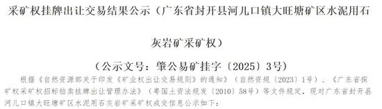 近日,广东省肇庆市自然资源局发布采矿权挂牌出让交易结果公示(广东省封开县河儿口镇大旺塘矿区水泥用石灰岩矿采矿权)显示,华润水泥(封开)有限公司以2.563亿元竞得上述水泥用石灰岩矿采矿权。