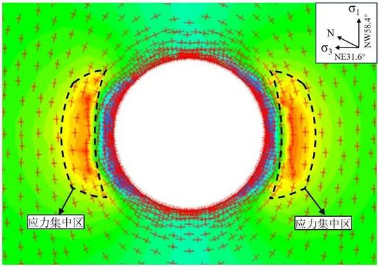 超长段钻孔释压作为高地应力深部地下工程中缓解地压灾害的有效释压手段,通过在井筒掘进工作面深部地层高应力岩体中布置合理的超长段释压钻孔,改善深部地层应力分布状态。当深部地层岩体变形达到极限时,岩体失去稳定状态,内部区域发生破裂,从而形成破裂区。当多个破裂区相互连接并贯通时,则形成连续的释压带。该方法不仅能降低钻孔周围岩体的应力集中程度,还会使应力峰值向地层岩体深部转移。