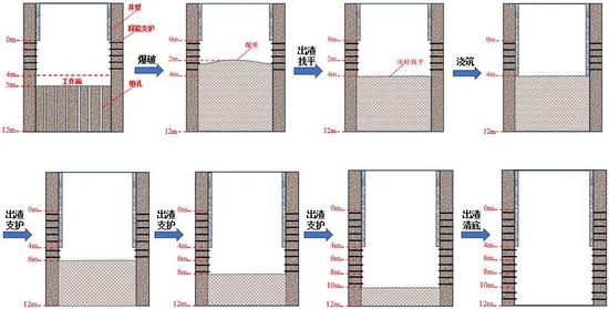 我国金属矿竖井建设通常采用“一掘一砌”的短段掘砌正规循环作业,此作业方案仍沿用于超深竖井建造时,常通过增加混凝土衬砌井壁厚度、提高混凝土强度等级等方式保障超深井筒稳定,但仍会出现井壁破坏、井筒失稳等工程问题。由此看出,亟需改进、优化传统竖井“一掘一砌”短段掘砌理念与施工工艺,以保障超深竖井的长期稳定。