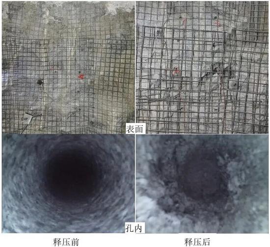 通过现场实施释压爆破后形成的破碎区边界较开挖面更远、更加深入围岩,且产生的应力峰值较小、应力峰值位置与开挖面相距更远,应力分布曲线也较为平缓,能够改善围岩应力集中条件,从而降低开挖面附近围岩发生高应力冲击破坏(如岩爆)的可能性。从机制上讲,释压爆破过程是爆破裂隙和爆破振动2个因子单独或联合作用,不但改变了岩体的应力状态,也改变了岩体的强度和变形能力。