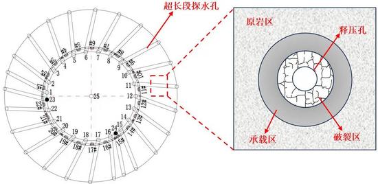 超前钻孔释压技术作为一种主动调控应力的方法在工程实践中被广泛应用,通过在井筒掘进工作面实施预钻孔释压,能够有效降低高地应力引发的工程风险,从而提高井筒施工的安全性。现场实施时,采用超长段(段高≥100 m)径向外倾斜角度钻孔探测高倾斜角度微裂隙高承压热水,同时利用超长段探水孔作为释压孔,主动调控井筒掘进工作面深部地层应力场,优化应力分布,降低后续施工过程中岩爆发生概率。