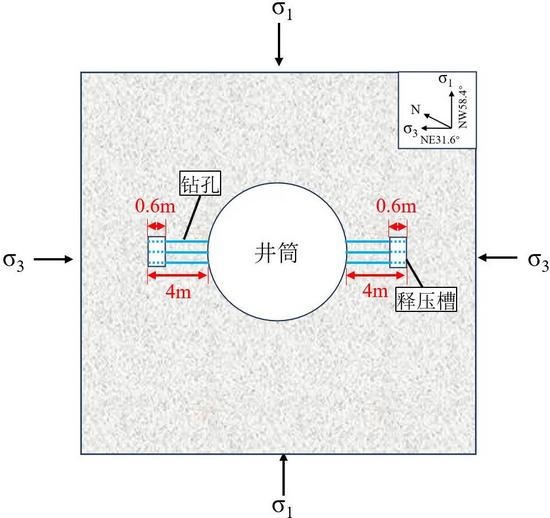 深部地层应力分布研究反映出:在井筒最小水平主应力方向产生应力集中,因此现场实施过程中在井筒围岩最小水平主应力方向施工钻孔,装药爆破形成释压槽。结合现场施工条件,确定释压槽宽度为0.6 m,距井筒围岩表面4 m