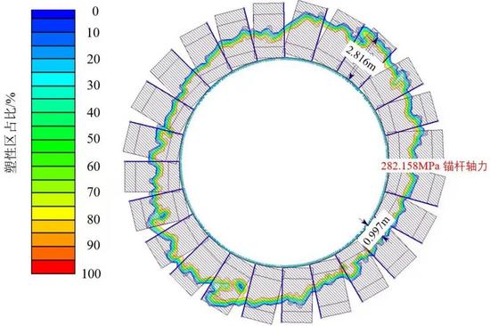 研究反映出:施加释能支护后,井筒围岩破坏深度减少49%~62%;3 m长度释能锚杆可实现锚固井筒围岩破坏区域、稳固井筒围岩,锚杆轴力为282 MPa,远低于锚杆本身的屈服强度(锚杆钢型为HRB400)。因此,释能支护能够主动调控围岩应力分布,提高围岩塑性区稳定性,阻止围岩进一步破坏,保证井壁结构稳定,为超前序次释压建造施工提供安全保障。