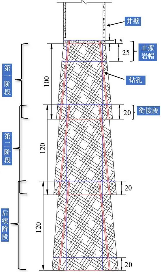 »»»收敛约束法能够用于对井筒深部高应力岩体的稳定性控制,通过对井筒开挖后围岩位移与支护抗力的平衡关系进行定量化分析,确定井筒支护时机与支护参数。研究表明:4 m掘进施工循环高度并不能满足井筒围岩压力调控的空间要求,井筒围岩释放应力的最佳空间为3个掘进施工循环高度,即衬砌混凝土井壁到井筒工作面间未衬砌混凝土段的距离为12 m,在未衬砌混凝土井壁段采用释压爆破和释能支护主动调控井筒围岩应力,保障井筒围岩的长期稳定,使衬砌混凝土井壁达到“免承压”效果。