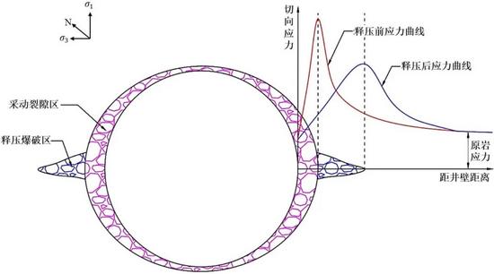 在2 005 m深竖井掘进过程中,采用壁后释压爆破技术主动调控井筒围岩应力状态,通过钻孔装药爆破产生的冲击波,使其在井筒围岩内产生切割裂缝,并使岩体裂隙萌生、扩展,在钻孔周围形成释压带,为井筒围岩压力提供释放补偿空间,达到改善井筒围岩应力状态、减缓或转移高应力集中、弱化岩爆风险的目的。