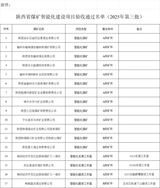 附件:陕西省煤矿智能化建设项目验收通过名单(2025年第三批)