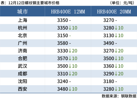 螺纹钢12月12日,全国31个主要城市20mm三级抗震螺纹钢均价3289元/吨,较上个交易日元/吨。近期市场仍处于消费淡季,市场成交难以好转;同时近期钢厂多有检修,产量有所下降,供需矛盾有一定累积。目前市场重回基本面主导预计下周国内建筑钢材价格或将延续窄幅震荡为主。