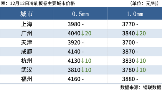 冷轧板卷:12月12日,全国24个主要城市1.0mm冷卷均价3883元/吨,较上个交易日跌5/吨。部分贸易商为促进出货,报价继续小幅下调,但下游终端采购意愿依旧不强,市场整体成交氛围清淡,多数贸易商反馈日内出货量维持在低位水平。心态方面,临近年末,终端企业多以消化现有库存为主,新增订单较少,贸易商对后市信心不足,仍以谨慎去库操作为主,预计下周冷轧板卷价格或将继续弱势调整运行。