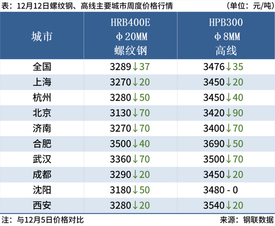 截至12月12日,全国主要城市20mm三级抗震螺纹钢均价3289元/吨,周环比下跌37元/吨;8.0mmHPB300高线均价3476元/吨,周环比下跌35元/吨。