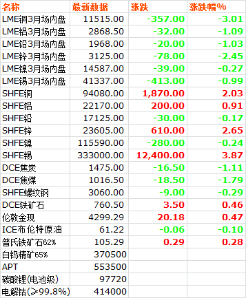 1212日,LME六种基本金属价格全线下跌。三月期铜价收于11515美元吨,下跌3.01%。三月期铝价收于2868.5美元吨,下跌1.09%。三月期铅价收于1968美元吨,下跌1.03%。三月期锌价收于3125美元吨,下跌2.45%。三月期锡价收于41337美元吨,下跌0.99%。三月期镍价收于14587美元吨,下跌0.27%