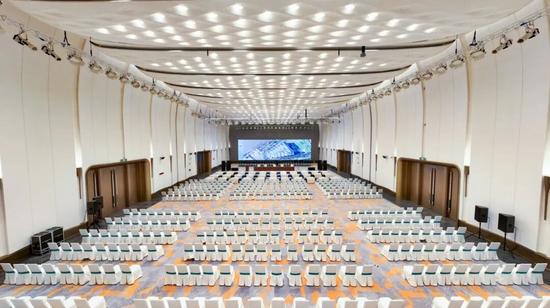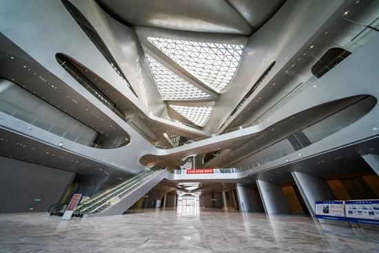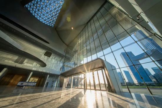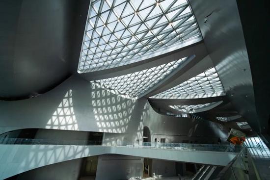 会堂室内设计强调科技感,顶部天窗应用帆船三角造型,各层廊桥交错连接