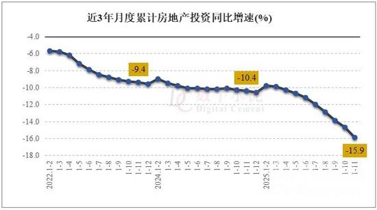 2025年1-11月,全国房地产开发投资7.86万亿元,同比下降15.9%,降幅较1-10月扩大1.2个百分点,较去年同期扩大5.5个百分点。其中,住宅投资6.04万亿元,同比下降15%。