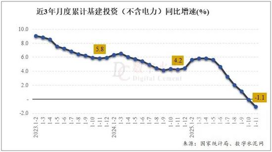 2025年1-11月,全国基础设施投资(不含电力)同比下降1.1%,降幅较1-10月扩大1个百分点,去年同期为增长4.2%。其中,铁路运输业投资同比增长2.7%,道路运输业投资同比下降4.7%,水利管理业投资同比下降3.2%。