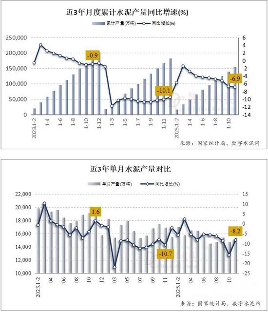 国家统计局数据显示,2025年1-11月,全国累计水泥产量15.49亿吨,同比下降6.9%,降幅较1-10月扩大0.2个百分点,较去年同期收窄3.2个百分点。11月份,全国单月水泥产量1.54亿吨,环比上升4.5%,同比下降8.2%。单月和累计产量均为2010年以来同期最低水平。