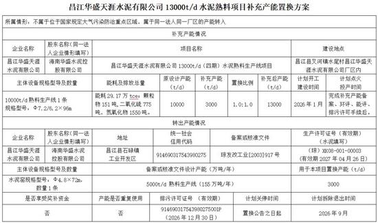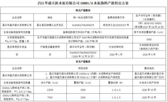 根据公示,华盛天涯昌江水泥熟料有限公司日产5000吨水泥熟料项目产能按照1:1的比例,分别转出至该公司13000t/d(四期)和7000t/d(三期)水泥熟料生产线项目。