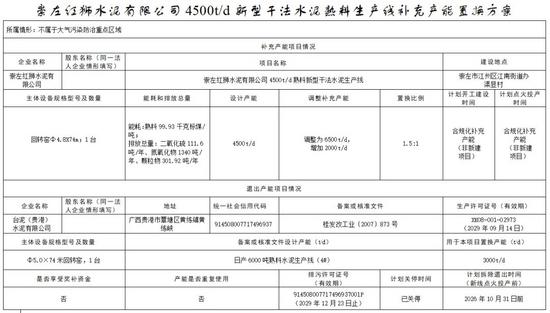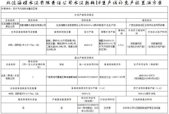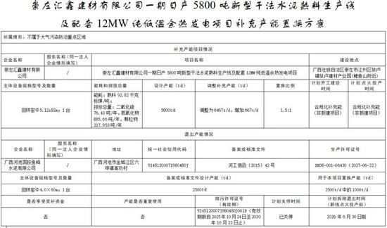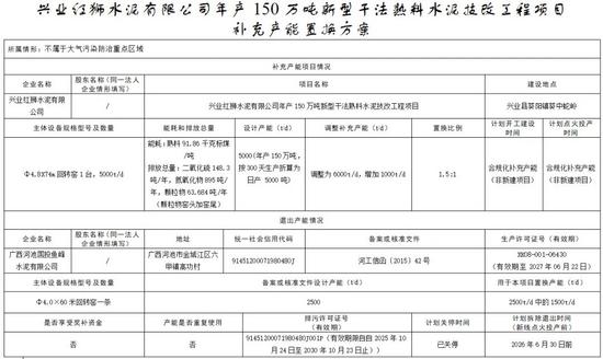 广西河池国投鱼峰水泥有限公司一条2500t/d水泥熟料线产能中的1000t/d和1500t/d按照1.5:1的比例,分别用于崇左汇鑫建材有限公司一期日产5800吨新型干法水泥熟料生产线及配套12MW纯低温余热发电项目兴业红狮水泥有限公司年产150万吨新型干法熟料水泥技改工程项目产能置换。该生产线目前已关停,计划2026年6月30日前拆除退出。