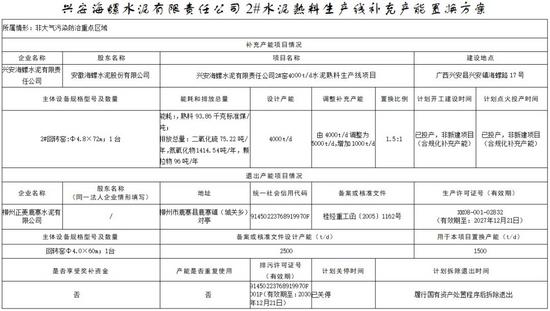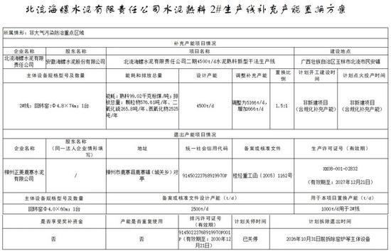 根据公示,柳州正菱鹿寨水泥有限公司一条2500t/d水泥熟料线中的1500t/d和1000t/d产能按照1.5:1的比例,分别用于兴安海螺水泥有限责任公司2#窑4000t/d水泥熟料生产线北流海螺水泥有限责任公司二期4500t/d水泥熟料新型干法生产线项目置换产能。该生产线目前已关停,计划履行国有资产处置程序后拆除退出。