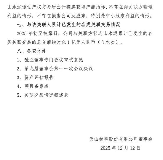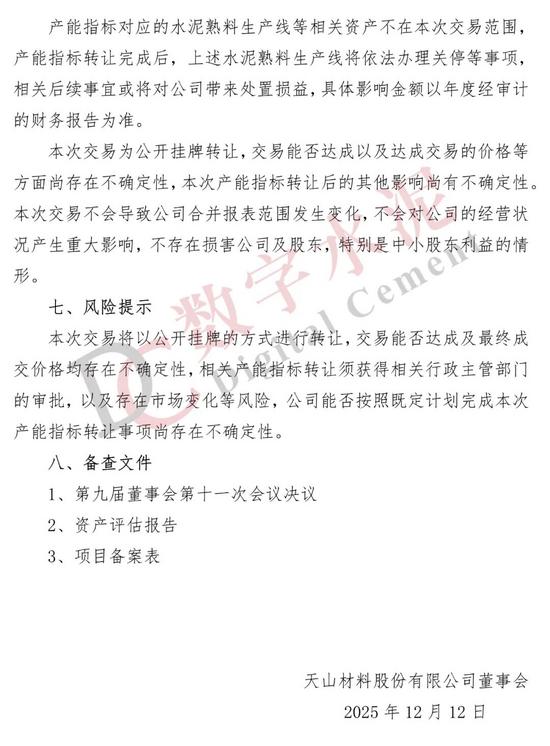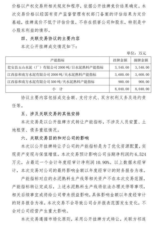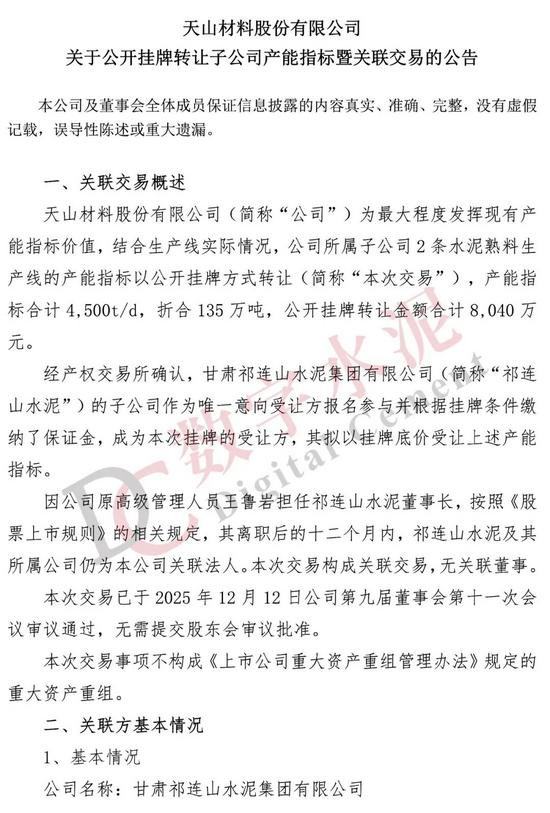 同日,天山股份还发布了《关于公开挂牌转让子公司产能指标暨关联交易的公告》显示,公司所属子公司2条水泥熟料生产线的产能指标以公开挂牌方式转让,产能指标合计 4,500t/d,折合 135 万吨,公开挂牌转让金额合计8,040万元。