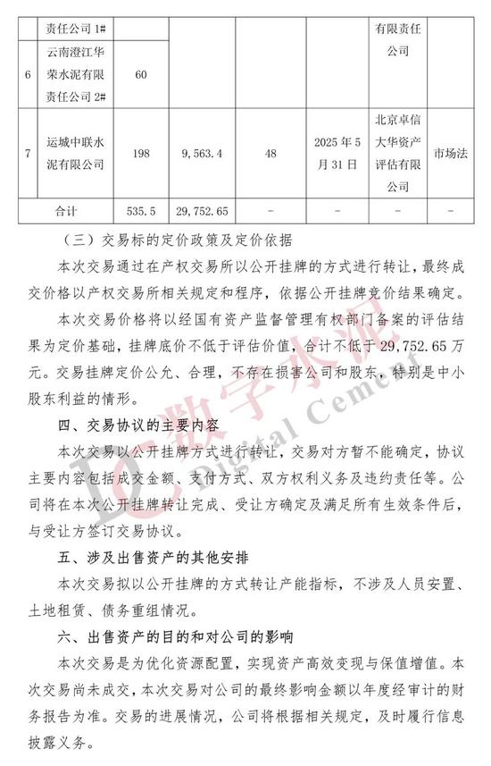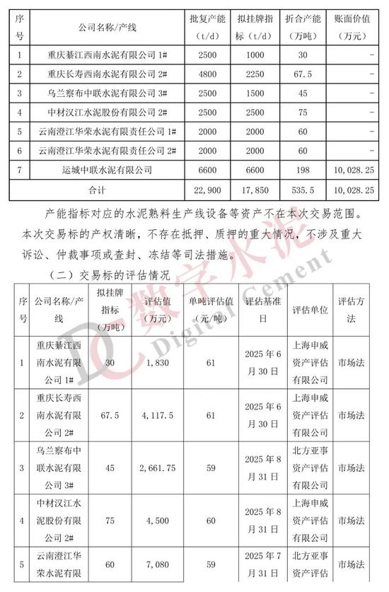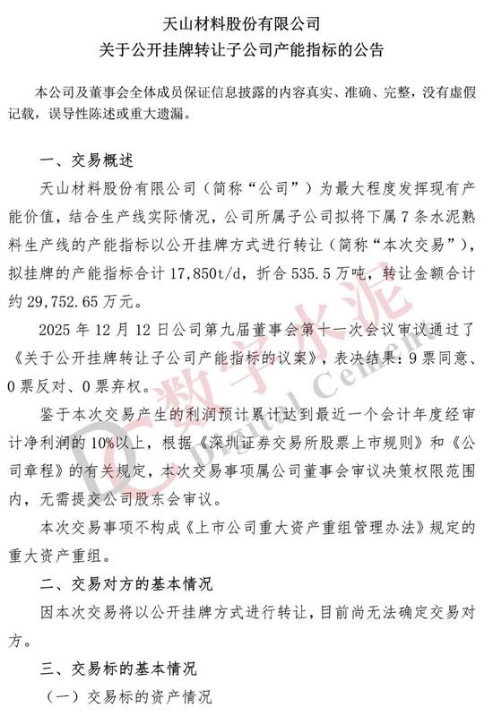 12月12日,天山股份发布《关于公开挂牌转让子公司产能指标的公告》显示,公司所属子公司拟将下属7条水泥熟料生产线的产能指标以公开挂牌方式进行转让,拟挂牌的产能指标合计17,850t/d,折合535.5万吨,转让金额合计约29,752.65 万元。