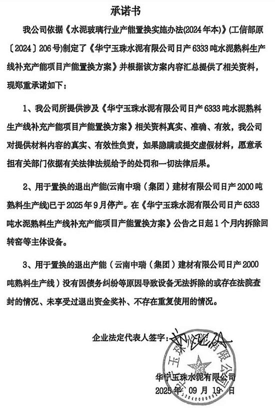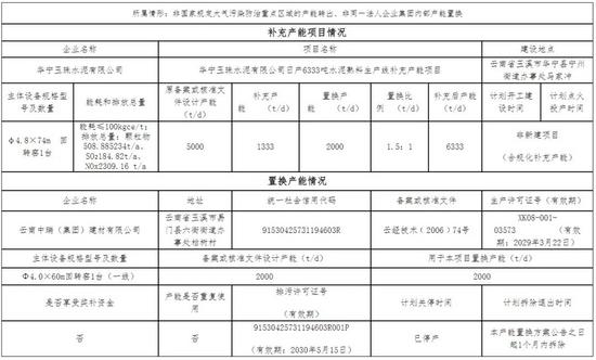 根据公示,华宁玉珠水泥有限公司日产6333吨水泥熟料生产线补充产能项目原备案或核准文件设计产能5000t/d,补充产能1333t/d,置换产能2000t/d,置换比例为1.5:1。云南中瑞(集团)建材有限公司一条2000t/d水泥熟料线用于本项目置换产能,目前该生产线已停产,计划在本产能置换方案公告之日起1个月内拆除。