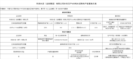 华润水泥(龙岩曹溪)有限公司日产3100吨水泥熟料生产线建设项目原备案或核准产能2500t/d,补充置换产能900t/d,置换比例为1.5:1。