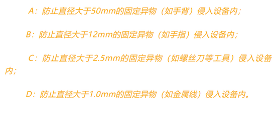 防护等级IP(Ingress Protection)后面的第三位字母是表示电气设备对人员防护的能力,一般表示防止人员触电的能力,由A、B、C、D四个字母组成。