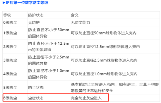 电池包要求等级为6,代表着最高等级的防尘要求: