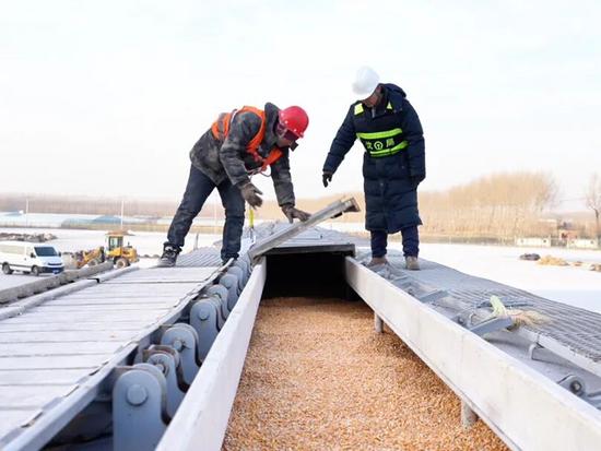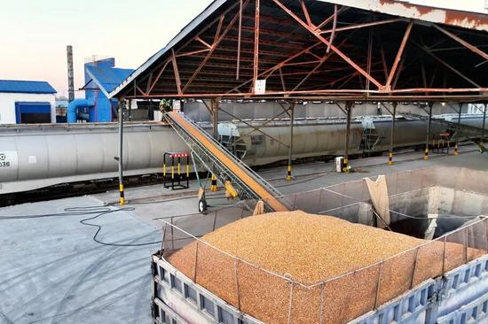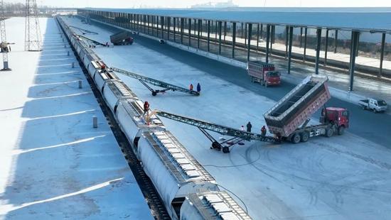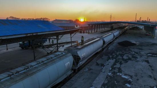 12月10日8时,中国铁路沈阳局集团有限公司长春铁路物流中心农安营业部的农安粮库专用线内,4台粮食输送机隆隆作响,3500吨金黄的玉米正源源不断地被灌入散粮车中。