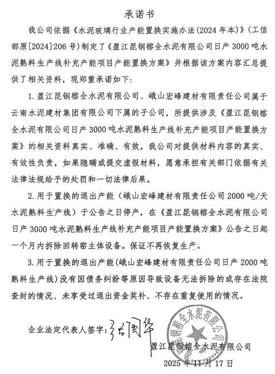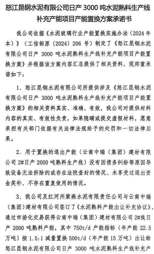 12月16日,云南省工业和信息化厅发布《怒江昆钢水泥有限公司日产3000吨水泥熟料生产线补充产能项目产能置换方案的公示》《盈江昆钢榕全水泥有限公司日产3000吨水泥熟料生产线补充产能项目产能置换方案的公示》称,按照《水泥玻璃行业产能置换实施办法(2024年本)》(工信部原〔2024〕206号)有关规定和水泥行业产能管理有关政策要求,现将“怒江昆钢水泥有限公司日产3000吨水泥熟料生产线补充产能项目产能置换方案”和“盈江昆钢榕全水泥有限公司日产3000吨水泥熟料生产线补充产能项目产能置换方案”进行公示。