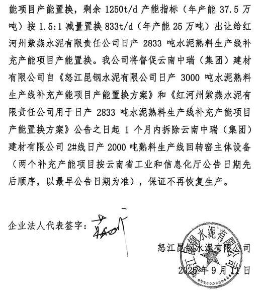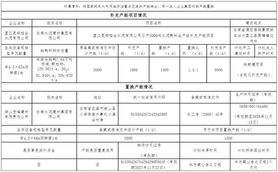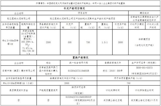 根据公示,怒江昆钢水泥有限公司日产3000吨水泥熟料生产线补充产能项目原备案或核准文件设计产能2500t/d,补充产能500t/d,置换产能750t/d,置换比例为1.5:1。云南中瑞(集团)建材有限公司一条2000t/d水泥熟料线中的750t/d用于本项目置换产能,计划在本方案公告之日起1个月内拆除退出。