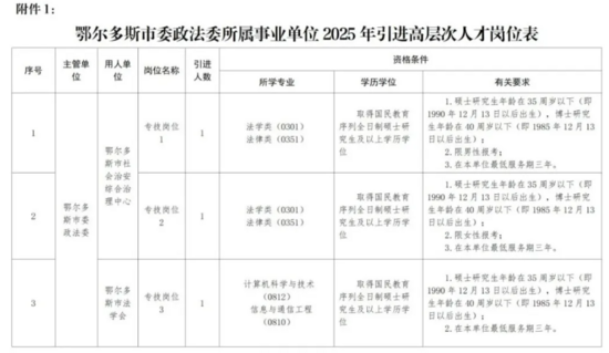 鄂尔多斯市委政法委所属事业单位市社会治安综合治理中心引进高层次人才2名、市法学会引进高层次人才1名