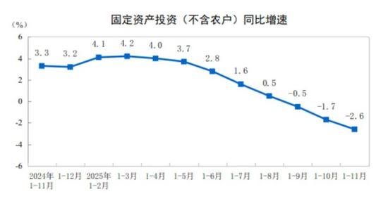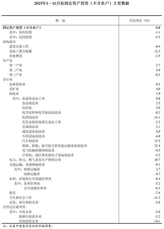 2025年1—11月份,全国固定资产投资(不含农户)444035亿元,同比下降2.6%(按可比口径计算,详见附注7)。其中,民间固定资产投资同比下降5.3%。从环比看,11月份固定资产投资(不含农户)下降1.03%。