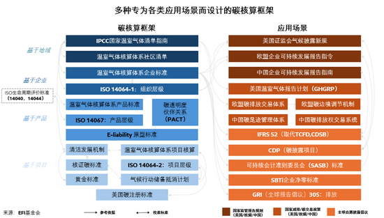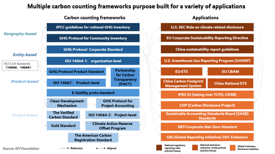 当前全球范围内的碳核算与报告框架格局中,各类指南数量已超十余套,这些框架中大多是为特定目标设计,并涵盖多种类型,包括基于地域(即国家清单)、覆盖企业整体、聚焦产品生命周期以及以项目为核心的核算。这其中聚焦企业层面报告的框架应用最为广泛,而那些支持基于产品全生命周期分析的框架,在国家政策或全球自愿性倡议中的应用则相对较少。