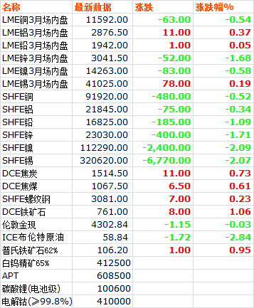 1216日,LME六种基本金属价格涨跌互现。三月期铜价收于11592美元吨,下跌0.54%。三月期铝价收于2876.5美元吨,上涨0.37%。三月期铅价收于1942美元吨,上涨0.05%。三月期锌价收于3041.5美元吨,下跌1.68%。三月期锡价收于41025美元吨,上涨0.19%。三月期镍价收于14263美元吨,下跌0.58%