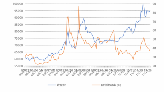11月至12月上旬碳酸锂逼仓风险解除,盘面多头持续拉涨动能不足,整体多空资本仍处于激烈对峙状态,国内主力维持较高规模空头敞口下半年,碳酸锂价格进入上涨通道,已由长期价格区间低位上涨至中部位置。国内期权市场由悲观恢复至中性,预期12碳酸锂价格主要在90000-110000吨区间运行。
