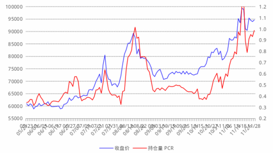 市场情绪由悲观恢复至中性,期权市场预期12月碳酸锂价格主要在90000-110000元/吨区间运行。11月下旬以来,碳酸锂期权隐含波动率逐步走低,11月28日报收于36.91%,处于近期较低水平。从碳酸锂期权最大持仓量所在行权价来看,11月28日,lc2602合约看跌期权最大持仓量所在行权价为90000元/吨,看涨期权较大持仓量距离较近者所在行权价为110000元/吨,国内期权市场预期12月碳酸锂价格主要在90000-110000元/吨区间运行。从碳酸锂期权持仓量来看,11月28日,看跌期权持仓量276207手,较上月同期增加174154手;看涨期权持仓量279793手,较上月同期增加85629手;看跌期权持仓量较上月同期增加较多,持仓量PCR报收于0.99,较上月同期大幅上升0.46,处于1.0多空分水岭附近,市场情绪明显恢复。