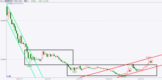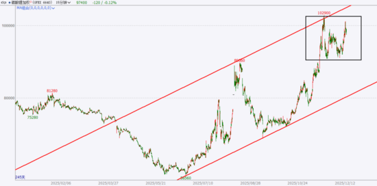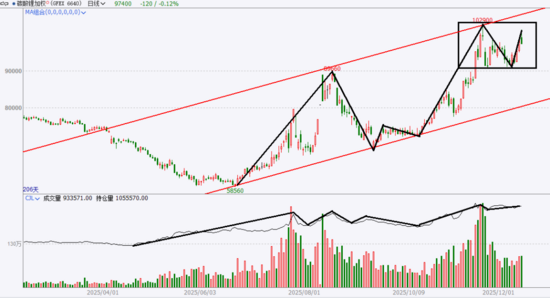 碳酸锂价格于上涨通道内下半年,碳酸锂价格进入上涨通道,11月碳酸锂价格向上突破90000压力位,在90000-103000区间震荡。