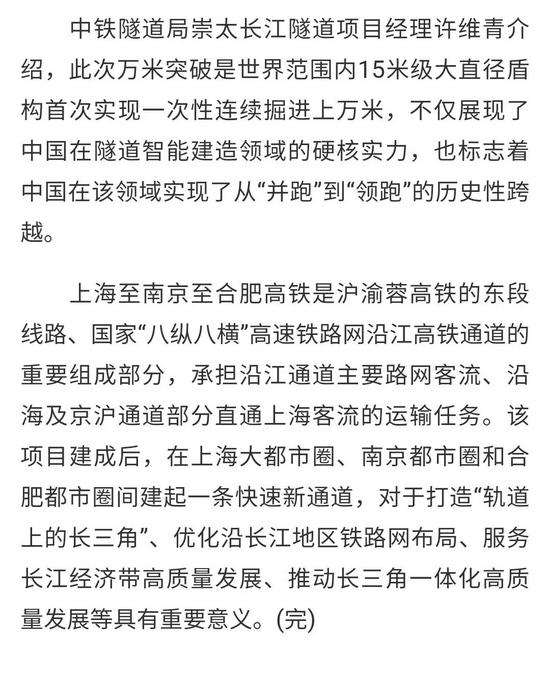 由中铁隧道局施工建设的崇太长江隧道是上海至南京至合肥高铁控制性工程,连接上海市崇明区和江苏省太仓市,全长14.25千米。该隧道具有多项世界之最:独头掘进长度达11.3255千米,是世界独头掘进距离最长的隧道;设计时速350公里,为世界行车速度最高的水下隧道;隧道深入长江水下89米,是目前长江最深江底隧道。项目建成运营后,将实现高铁穿越长江不减速的壮举。