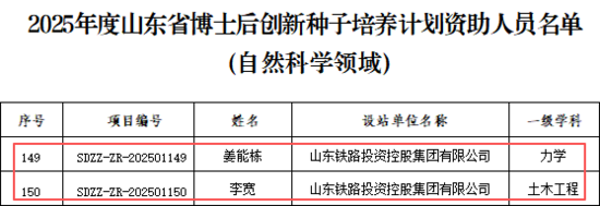 近日,山东省人力资源和社会保障厅公布2025年度山东省博士后创新种子培养计划入选名单,山东铁投集团博士后姜能栋、李宽成功入选,这是集团在高层次创新人才培养方面取得的又一重要突破。
