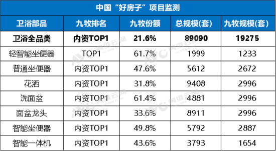 据奥维云网中国好房子项目卫浴配套市场调研数据显示,2025年1~8月,在一线、新一线19城中,住建部、各地政府机构、房地产协会及房地产权威研究机构评定公示 的“好房子”项目,九牧以21.6%的份额占据卫浴全品类内资TOP1的位置,尤其是在轻智能坐便器部品中,九牧以61.7%的份额荣登榜首,打破外资垄断。在普通坐便器、花洒等其他六大核心部品中,九牧均位居内资第一,成为各地好房子项目的主流选择。