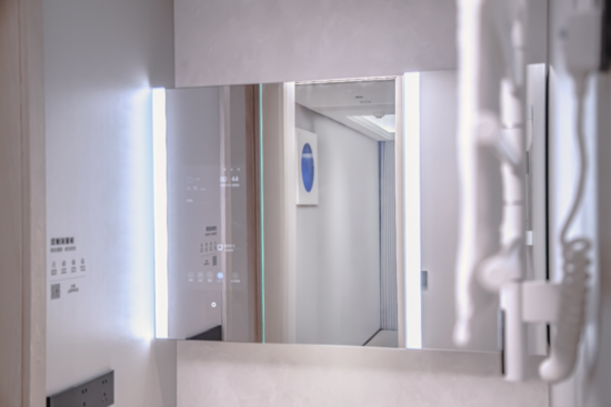 在江苏省住建厅样板间和宁波市住建局样板间,搭载15.6寸智能魔镜的浴室柜进一步拓展智慧场景。镜面自动感应环境温湿度,并提供个性化刷牙指导,将日常洗漱升级为健康管理体验。