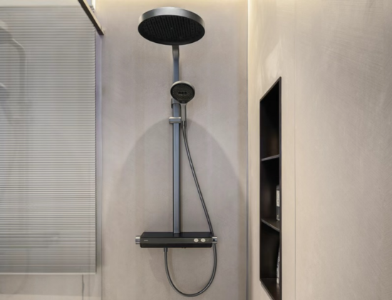 移步淋浴区,轻智能丝雨置物花洒保持恒温出水,智慧数显实时显示水温,通过远程遥控功能,使用者可预先排空管道中的冷水,告别了传统淋浴反复试温的困扰。旁边的电热毛巾架持续保持着适宜温度,不仅能快速烘干毛巾,还具备杀菌功能,确保洗漱用品的洁净卫生。