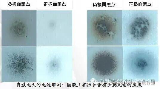 通过观察和测量隔膜黑点的数量、形貌、大小、元素成分等,来判断电池物理自放电的大小及其可能的原因:1)一般情况下,物理自放电越大,黑点的数量越多,形貌越深(特别是会穿透到隔膜另一面);2)依据黑点的金属元素成分判断电池中可能含有的金属杂质。