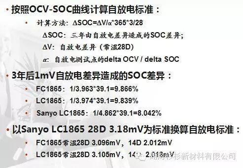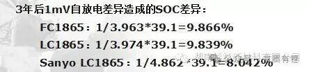 因电池容量差异,故实际电池的SOC存在波动,公差约为4%左右,故考察5%的公差范围内OCV曲线斜率的变化。LC1865 53%和99.9%SOC处斜率很稳定,分别为3.8mV/%SOC和10mV/%SOC。FC1865~25%SOC处斜率比较稳定;当然满电态也是个简单实用的自放电测量点。