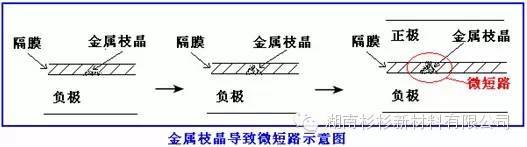 电池中:金属杂质发生化学和电化学腐蚀反应,溶解到电解液:M→Mn+ne;此后,Mn迁移到负极,并发生金属沉积:Mn+ne→M;随着时间的增加,金属枝晶在不断生长,最后穿透隔膜,导致正负极的微短路,不断消耗电量,导致电压降低。