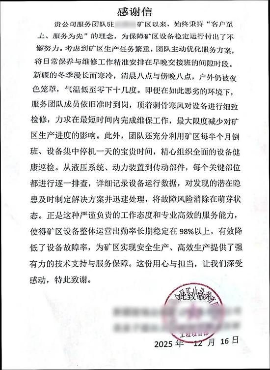 “你们严谨负责的工作态度和专业高效的服务能力,使得矿区设备整体运营出勤率长期稳定在98%以上,有效降低了设备故障率……”12月17日,一封感谢信和一面鲜红的锦旗,送到了柳工矿山后市场服务团队的手中。这封感谢信自严寒北疆而来,背后是柳工服务团队扎根矿区用心用情护航生产的故事。
