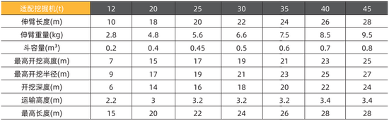 · 作业范围飙升:适配 12-45 吨挖掘机,伸臂长度覆盖 10-28 米,开挖深度可达 6-24 米、最高开挖半径 7-27 米 —— 以 45 吨机型为例,伸臂长度 28 米、开挖深度 24 米,轻松触达普通挖机无法覆盖的深基坑、河道底部。