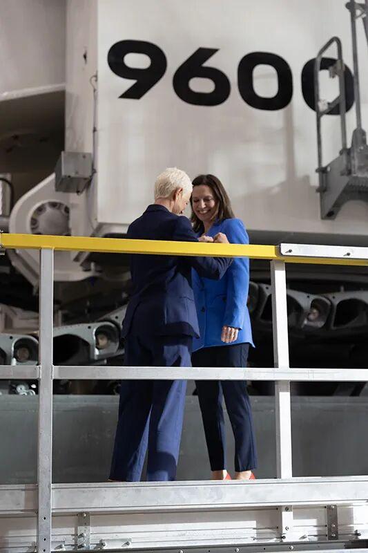 Sophie Albrecht作为利勃海尔集团董事会成员,于今年十一月获颁此项荣誉(法国国家功绩勋章French National Order of Merit)。授勋仪式在利勃海尔矿山设备科尔玛(Colmar)的工厂场地举行,现场背景为一台R 9600矿用挖掘机。阿尔萨斯(Alsace)政治家、上莱茵省(Haut-Rhin)第一选区国会议员Brigitte Klinkert在讲话中强调了Sophie Albrecht特对法国尤其是阿尔萨斯工业的奉献精神。她指出,作为公司创始人汉斯·利勃海尔的孙女,Sophie Albrecht具备将商业成功、社会责任与人文关怀相结合的能力。这位地方政要同时对利勃海尔集团为当地经济所作的重大投资表示感谢。