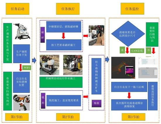 巷道清理机器人工程应用工艺流程如图5所示,清理机器人根据巷道围岩变形情况进行3个工作节拍的清理作业。智能清理工艺模型以定位-作业-判识为核心基础工艺,通过任务派发,移动平台进行初步定位,机械臂通过雷达与视觉融合系统进行高精找正(清理目标识别),巷道清理机器人按照不同功能要求进行作业。