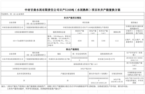 中材甘肃水泥有限责任公司5166t/d水泥熟料生产线项目原设计产能4500t/d,补充产能666t/d,置换比例为1.5:1。天水中材水泥有限责任公司1#2500t/d熟料生产线中的1000t/d用于本项目置换产能。
